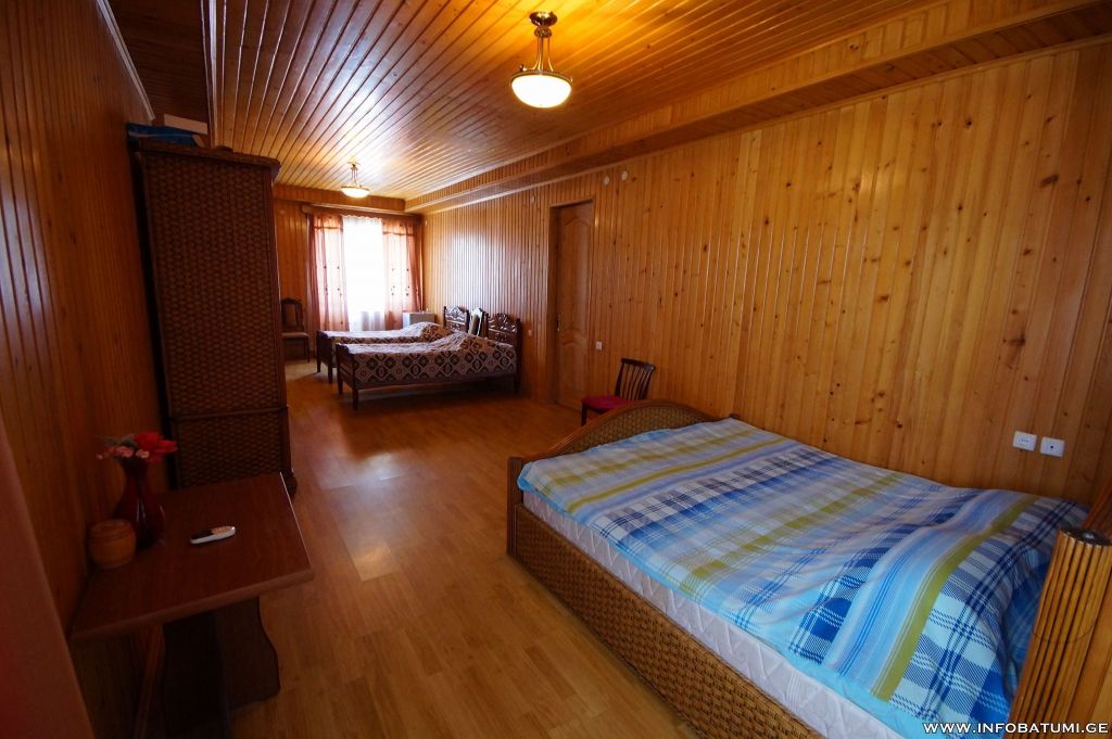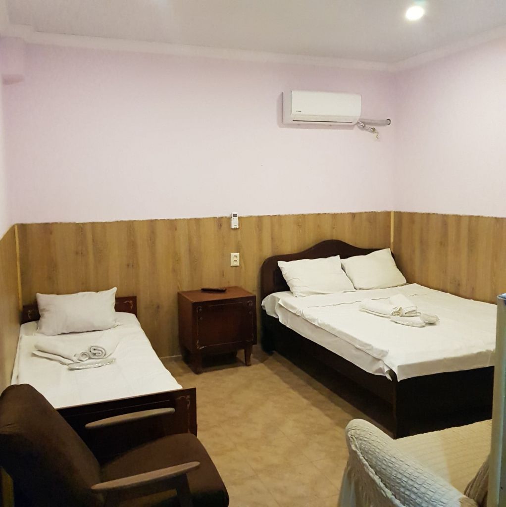 Family-type hotel for rent, 3-bed rooms, close to the sea, with its own yard, rooms are provided - air conditioning, internet, plasma TV, refrigerator, bathroom, parking, has a balcony, 150-160 meters from the sea