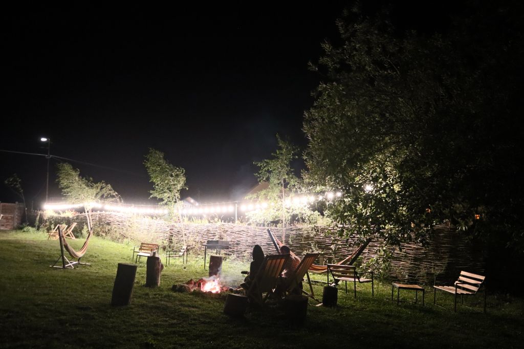 ეზოში არის მაყალი, კოცონის დასანთები ადგილი, საბავშვო სივრცე, ღია კინოთეატრი, სხვადასხვა მოსასვენებელი სივრცეები.